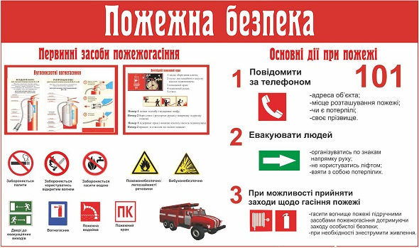 ● у разі пожежної небезпеки — наявності вогню, іскріння, диму — негайно вийти на повітря (за двері, балкон) та кликати на допомогу. Викликати службу пожежної охорониза номером 101, назвавши своє ім'я, прізвище, коротко описавши ситуацію: наявність вогню, диму, кількість людей у приміщенні, свій номер телефону;